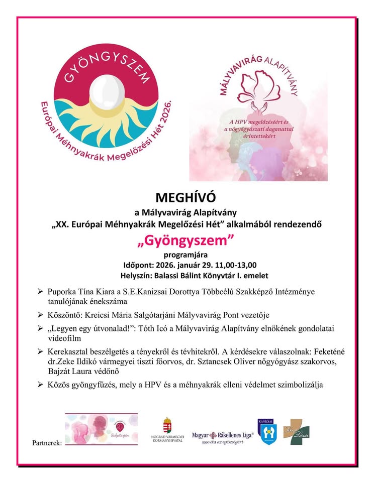 A Salgótarjáni Mályvavirág Pont idén is programokkal csatlakozik az Európai Méhnyakrák Megelőzési Héthez. Január 19. és 25. között zajlik a XX. Európai Méhnyakrák Megelőzési Hét. Az eseménysorozathoz csatlakozva szervezik meg Salgótarjánban január 29-én, csütörtökön 11 órától a Gyöngyszem – Mikor adtál utoljára időt magadnak, hogy vigyázz a jövődre? című programot. A Balassi Bálint Könyvtár első emeletén előbb a Semmelweis Egyetem Kanizsai Dorottya Többcélú Szakképző Intézménye „Infusion” zenekara énekel majd.