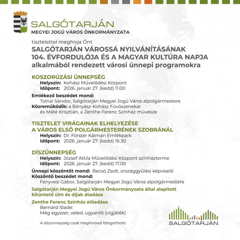 Ünnepeljük együtt a várossá nyilvánítás 104. évfordulóját és a Magyar Kultúra Napját 2026. január 27-én! A városi díszünnepségre meghívók a Civil Központban még igényelhetőek. Az igényeket mihamarabb jelezzétek!