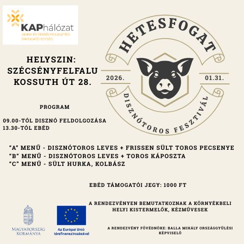 Szécsényfelfaluban disznótoros fesztivált rendez a Hetesfogat Egyesület január 31-én, szombaton. Az esemény a Kossuth út 28. szám alatt zajlik majd. A résztvevők a disznó feldolgozásához 9 órakor látnak hozzá, majd 13 órától lakomára várják a szervezők az érdeklődőket, akik három disznótoros menü közül választhatnak. A rendezvényen bemutatkoznak a helyi és környékbeli kistermelők és kézművesek.
