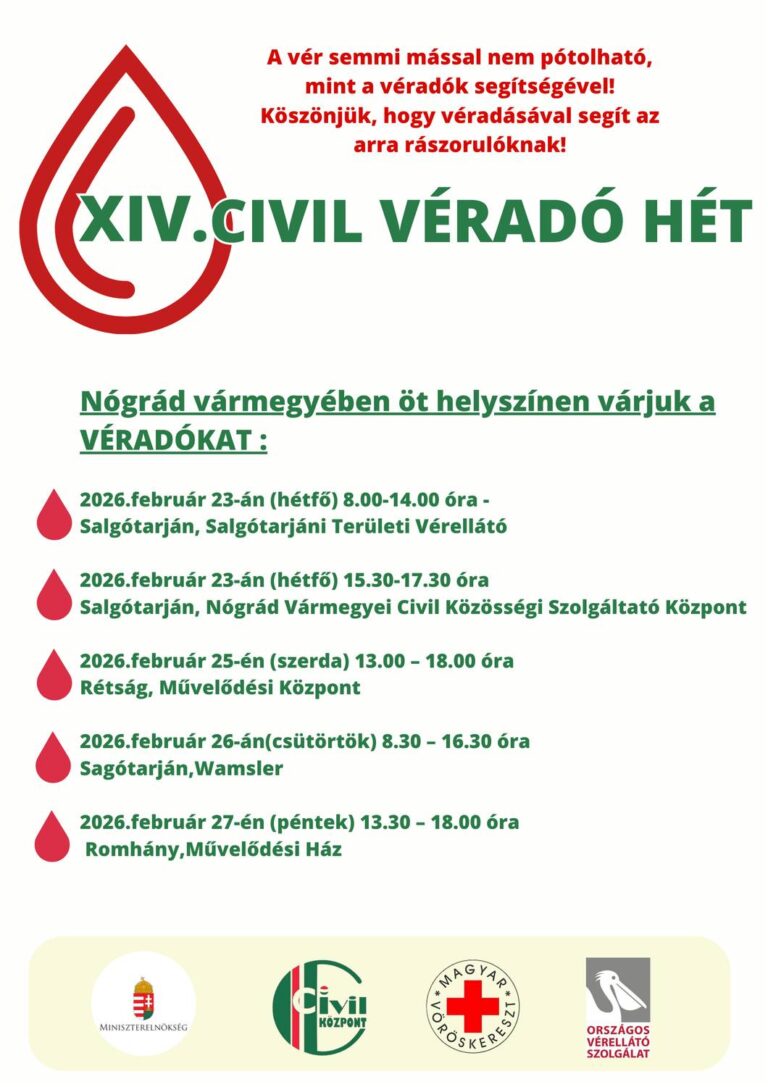 A Miniszterelnökség Civil és Társadalmi Kapcsolatokért Felelős Helyettes Államtitkársága az Országos Vérellátó Szolgálattal, a Magyar Vöröskereszttel, illetve a civil közösségi szolgáltató közösségi szolgáltató központok hálózatával együttműködésben szervezi meg a XIV. Civil Véradást. Nógrád vármegyei helyszínek és időpontok:2026.02.23. 8:00-14:00 Salgótarjáni Területi Vérellátó (3100 Salgótarján, Füleki út 54-56.)2026.02.23. 15:30-17:30 Civil Szolgáltató Központ (3100 Salgótarján, Klapka György tér 4.)2026.02.25. 13:00-18:00 Rétság-Művelődési Központ (2651 Rétság, Rákóczi út 26.)2026.02.26. 8:30-16:30 Wamsler (3100 Salgótarján, Hősök útja