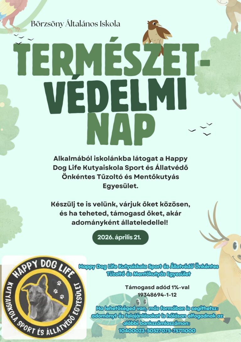 A természetvédelem és a felelős állattartás kerül a középpontba a Börzsöny Általános Iskolában, ahol április 21-én a Happy Dog Life mentőkutyásai tartanak bemutatót. Az esemény során a diákok nemcsak a négylábú hősök munkájával ismerkedhetnek meg, hanem adományokkal is segíthetik az egyesületet.