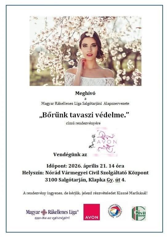 A bőr ápolása kerül a salgótarjáni alapszervezet programjának középpontjába. A Magyar Rákellenes Liga Salgótarjáni Alapszervezete szervezésében ismét fontos és aktuális témában kaphatnak tájékoztatást az érdeklődők április 21-én, kedden. A „Bőrünk tavaszi védelme” című rendezvény vendége az egyik legismertebb kozmetikai vállalat lesz. A 14 órakor kezdődő programnak a Nógrád Vármegyei Civil Szolgáltató Központ ad otthont. Az esemény ingyenes, de az érdeklődőktől azt kérik, hogy részvételi szándékukat előre jelezzék.