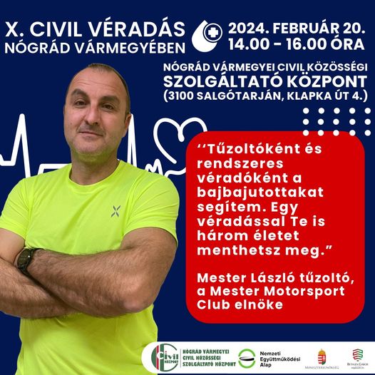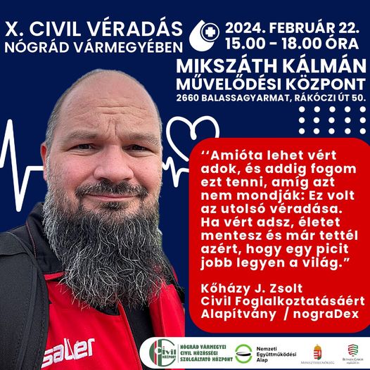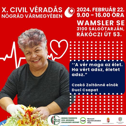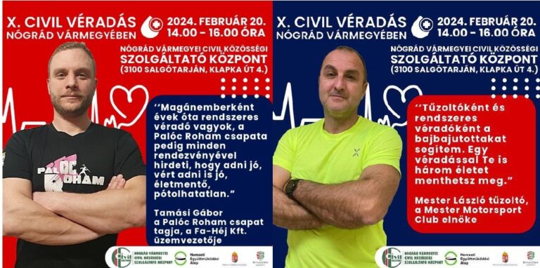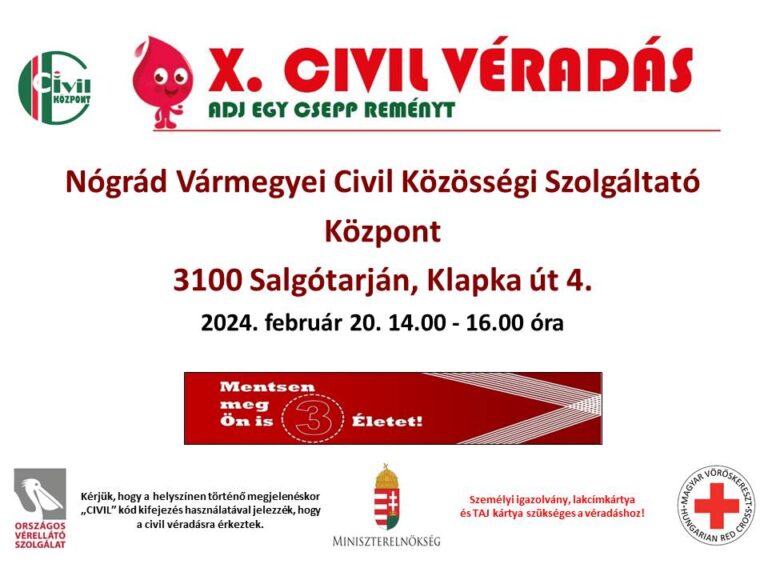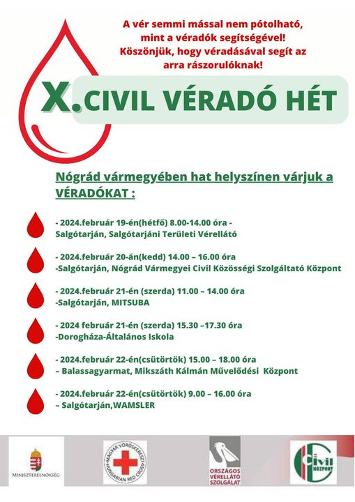 Folytatódik a X. Civil Véradás 2024. szeptember 21-én is! – 2024. február 21. 11.00 – 14.00 óra – Mitsuba Hungary Kft. (3100 Salgótarján, Patak út 3.) – 2024. február 21. 15.30 – 17.30 óra – Móra Ferenc Általános Iskola (3153 Dorogháza, Malom út 108.)