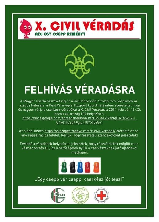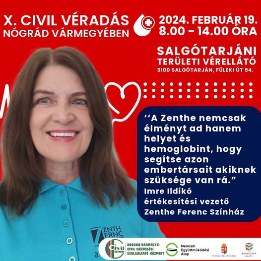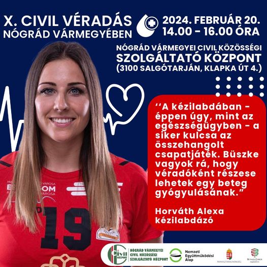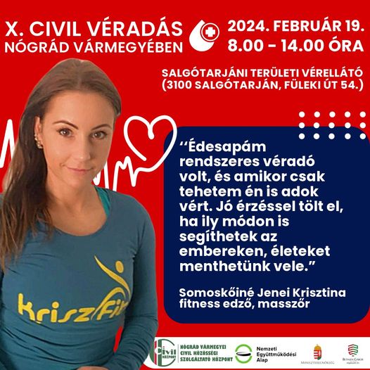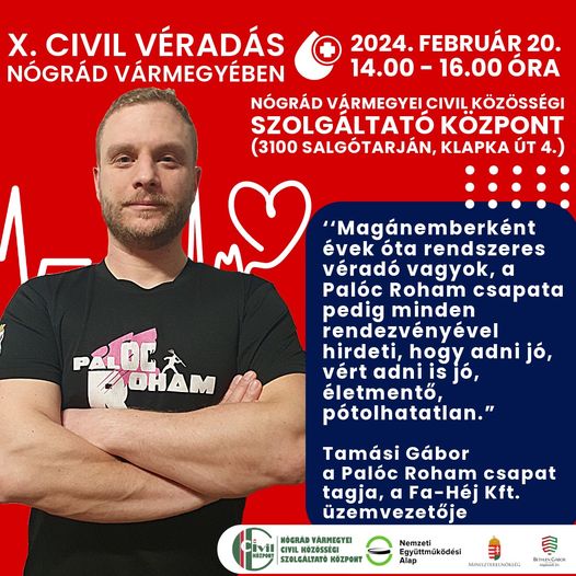 A X. Civil Véradó Hét keretében Nógrád vármegyében hat helyszínen várjuk a véradókat – 2024. február 19. 8.00 – 14.00 óra – Salgótarjáni Területi Vérellátó (3100 Salgótarján, Füleki út 54.) – 2024. február 20. 14.00 – 16.00 óra – Nógrád Vármegyei Civil Közösségi Szolgáltató Központ (3100 Salgótarján, Klapka út 4.) – 2024. február 21. 11.00 – 14.00 óra – Mitsuba Hungary Kft. (3100 Salgótarján, Patak út 3.) – 2024. február