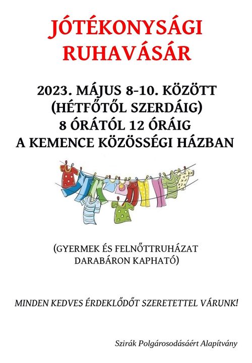 Jótékonysági ruhavásárt szervez a Szirák Polgárosodásáért Alapítvány a településen május 8. és 10. között. Azok, akik szeretnének a gyermek és felnőttruhákból vásárolni hétfőtől szerdáig, 8 és 12 óra között tehetik azt meg a Kemence közösségi házban – adta hírül közösségi oldalán az alapítvány. Mint arról beszámoltak, a ruhaneműket darabáron lehet majd beszerezni.
