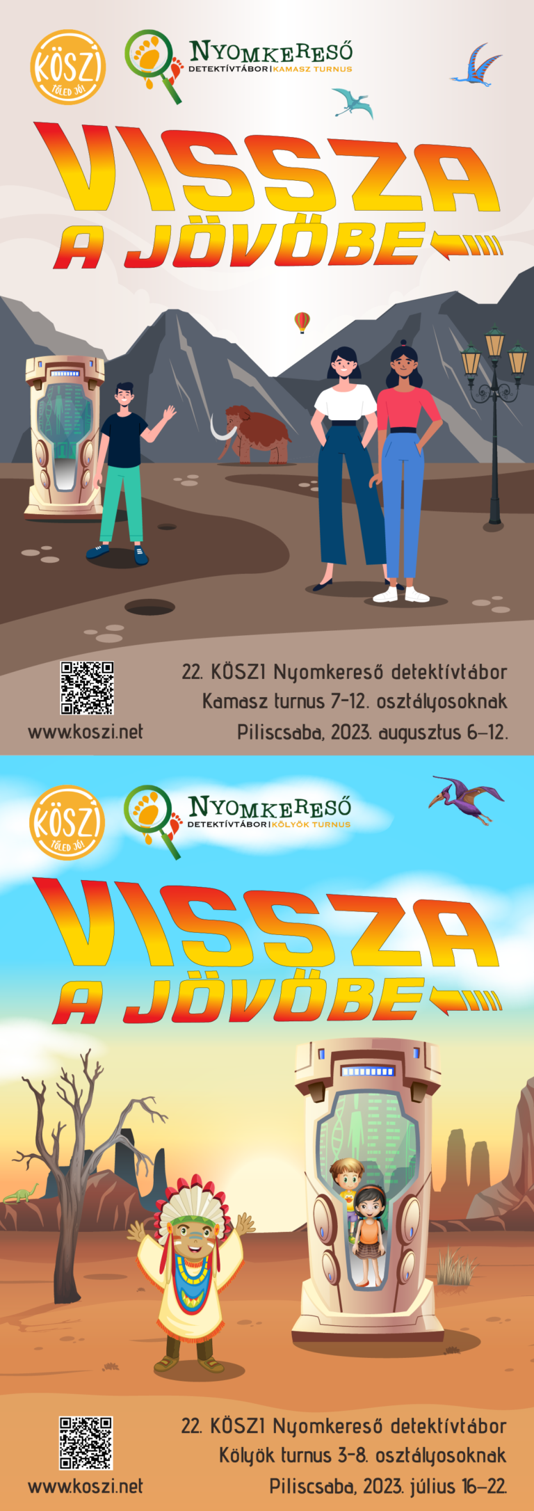 Kölyök (1.) turnus: 3–8. osztályosoknak, 2023. július 16-22.Kamasz (2.) turnus: 7-12. osztályosoknak, 2023. augusztus 6-12. Mottó: Vissza a jövőbeSzeretnéd egy nyári hétre hátrahagyni a gondjaidat, s egy rejtély közepébe csöppenni, amit új barátaiddal közösen kell megfejtenetek? Szabadulós játék, logikai fejtörők, helyszínelés, szerepjáték és más vetélkedők várnak rád, családias közösségben!