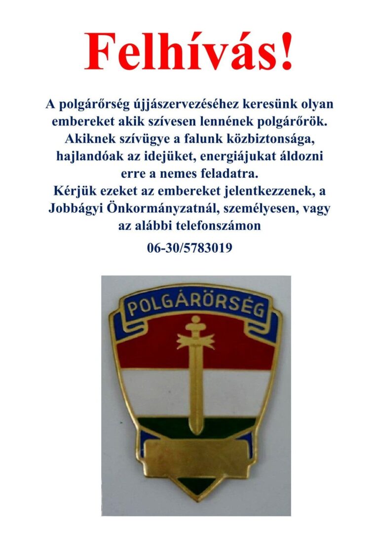 A polgárőrség újjászervezéséhez keresnek olyan embereket, akik szívesen töltenék be ezt a pozíciót, akiknek szívügye a falu közbiztonsága és hajlandóak az idejüket, energiájukat áldozni erre a nemes feladatra. Kérik az érdeklődőket, hogy Jobbágyi Község Önkormányzatánál személyesen vagy a 06 30/5783019-es telefonszámon jelentkezzenek. A felhívást a település Facebook-oldalán osztották meg.