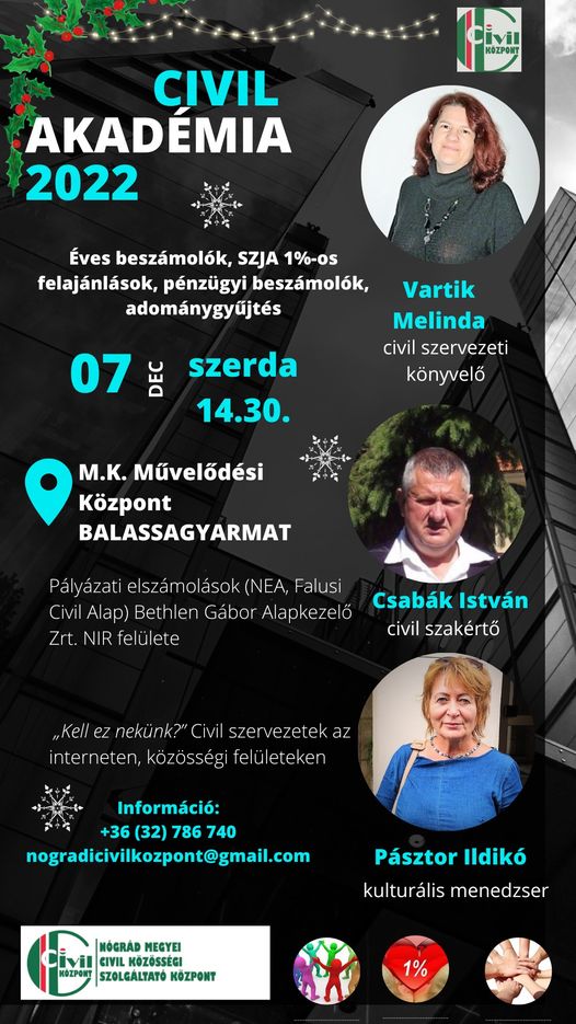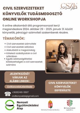 Jelentkezési határidő: 2025. augusztus 25. A workshop program 9 online alkalomból (2025. szeptember 01. és november 05. között) és 1 személyes részvételen alapuló (Vármegyei Civil Központ által megjelölt helyszínen) programsorozatból áll, amely tanúsítvány átadással zárul. Az előadások alkalmanként 2 x 45 perc időintervallumban kerülnek megrendezésre, különböző civil szervezeteket érintő témaköröket körbejárva. Minden előadás a témában jártas tapasztalt előadókkal, moderátorokkal a gyakorlatiasság elvét követve valósul meg. Ugyanazon téma, heti három alkalommal