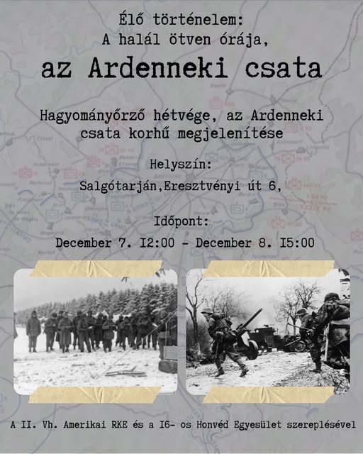 Megelevenedik a történelem Salgótarján népszerű kirándulóhelyén. A második világháború ardenneki csatája adott ihletet a hadijátékhoz. A 16-os Honvéd Katonai Hagyományőrző és Kulturális Egyesület most hétvégén, december 7-én, szombaton 12 órától egészen sötétedésig és december 8-án, vasárnap reggel 9 órától kora délutánig Eresztvényben hagyományőrző programot szervez. Az érdekesnek ígérkező eseményen a második világháború ardenneki ütközetét jelenítik meg korhűen a hagyományőrzők. Ezt a csatát egyébként A halál ötven órája című, 1965-ben bemutatott háborús filmben is feldolgozták.