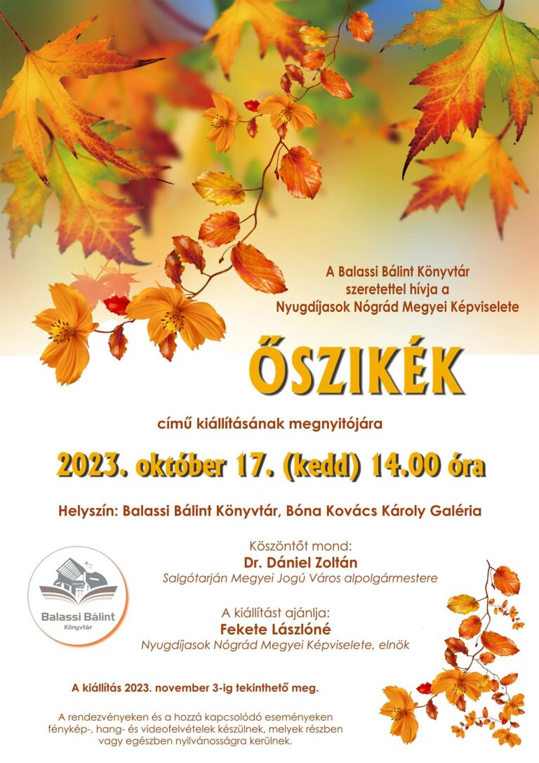 Őszikék címmel nyílik kiállítás a Nyugdíjasok Nógrád Megyei Képviselete tagjainak munkáiból október 17-én, kedden 14 órától a Balassi Bálint Könyvtárban. A salgótarjáni bibliotéka Bóna Kovács Károly Galériájában a megjelenteket dr. Dániel Zoltán, Salgótarján alpolgármestere köszönti majd. Ezt követően a tárlaton megtekinthető alkotásokat Fekete Lászlóné, a Nyugdíjasok Nógrád Megyei Képviseletének elnöke ajánlja a résztvevők figyelmébe. A kiállítás november 3-ig látogatható.