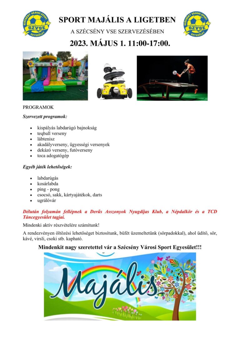 A Szécsényi Városi Sport Egyesület a közösségi oldalán számolt be arról, hogy május 1-jén, hétfőn 9 és 17 óra között sportmajálist rendez a Ligetben. A szervezők egyebek mellett kispályás labdarúgó bajnoksággal, teqball versennyel, lábtenisszel, valamint akadály- és ügyességi megmérettetésekkel is várja majd a látogatókat. A résztvevőknek lehetőségük lesz továbbá focizni, csocsózni, kosárlabdázni, ping-pongozni, sakkozni, kártyázni, valamint dartsozni is. A rendezvényen fellép majd a Derűs Asszonyok Nyugdíjas Klub, a Népdalkör és