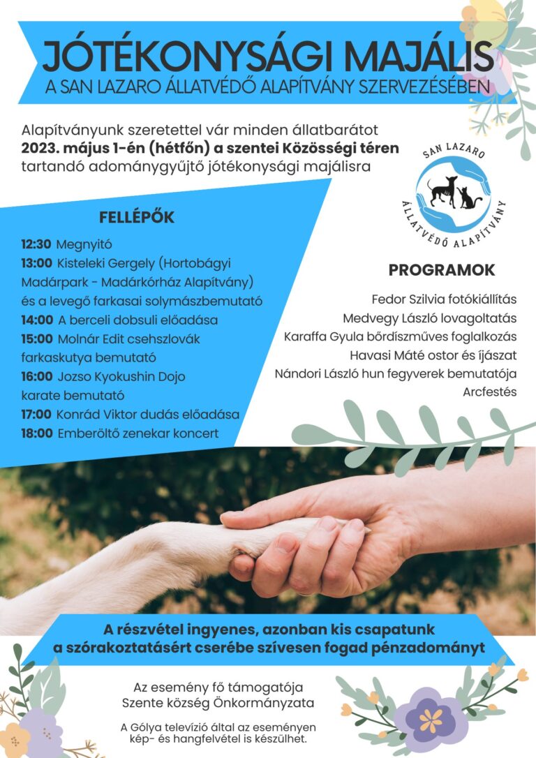 A San Lazaro Állatvédő Alapítvány a közösségi oldalán számolt be arról, hogy május 1-jén, hétfőn a szentei Közösségi téren jótékonysági majálist tartanak a helyi önkormányzat támogatásával.
