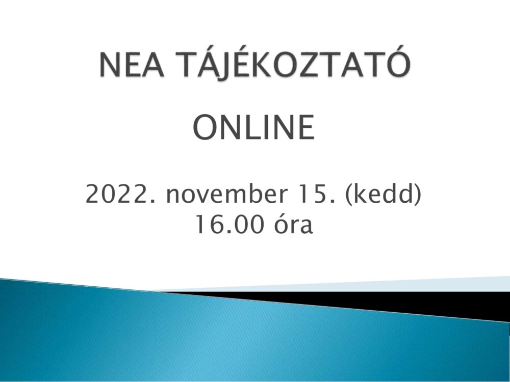 – Tájékoztató a NEA 2023 pályázatairól. A rendezvény időpontja: 2022. november 15. (kedd) 16.00 óra
