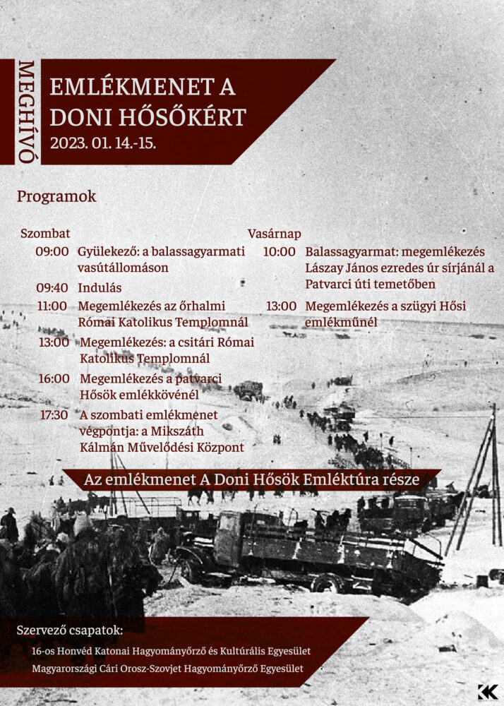 A 16-os Honvéd Katonai Hagyományőrző és Kulturális Egyesület idén is megtartja hagyományos Doni emlékmenetét. Az érdeklődők január 14-én, szombaton Balassagyarmatról a 9 óra 40 perckor induló vonattal utaznak Őrhalomba, aztán a település római katolikus templomának falán található I. és II. világháborús emlékművön 11 órakor helyezik el a koszorúikat.