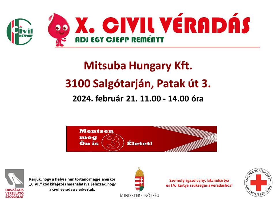 – 2024. február 21. 11.00 – 14.00 óra – Mitsuba Hungary Kft. (3100 Salgótarján, Patak út 3.)