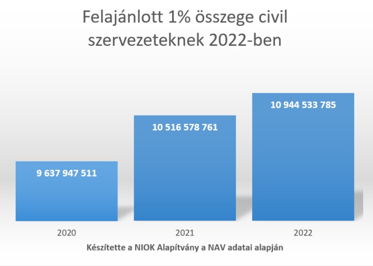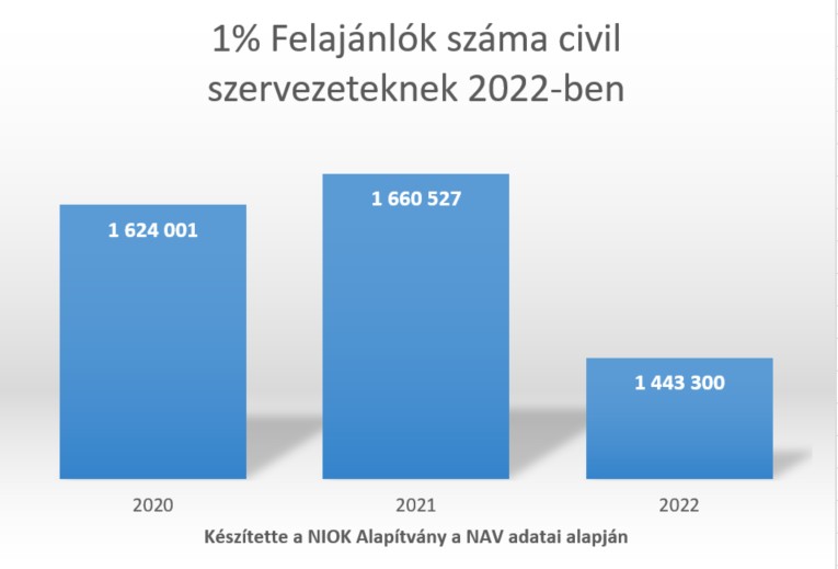 A NIOK (Nonprofit Információs és Oktató Központ Alapítvány) által a NAV adataiból készített elemzésből az is kiderül, hogy összesen több, mint 3,24 millió leadott érvényes nyilatkozat érkezett hozzájuk, amiből 1,44 millió volt a civil szervezetek számára felajánlott, és 1,82 millió az egyházak számára felajánlott technikai 1%. Az elemzésből látszik, hogy amíg a civil szervezeteknek felajánlók száma csökkent 2022-ben, az egyházaknak felajánlók száma 130 ezerrel nőtt.