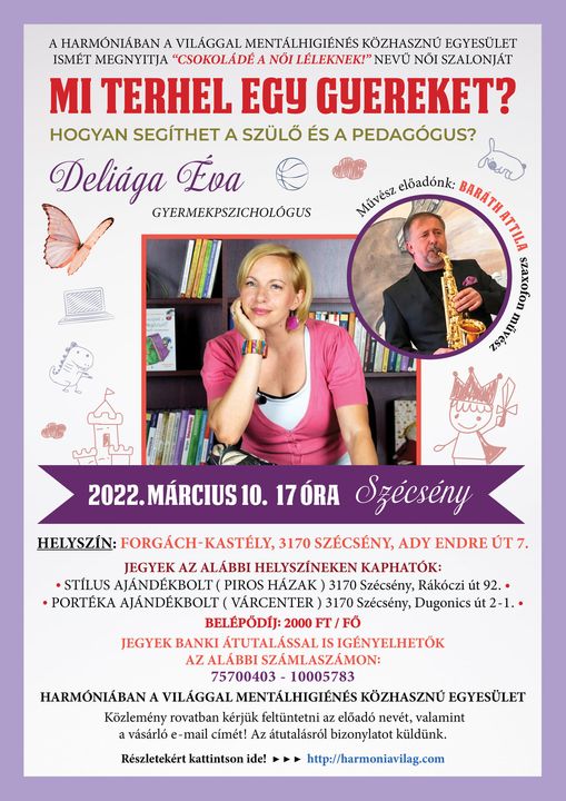 – Március 10-én Deliága Éva gyermekpszichológus előadását hallgathatjuk meg, aki a gyermeki szorongásról s annak kezeléséről szól. Ez mindig aktuális téma, ám napjainkban nagyon időszerű, hiszen a pandémia mindenki életére rátelepedett. A gyermekek átveszik a szülők félelmeit, de környezetükben is megtapasztalják a negatív hatásokat. Ugyanakkor nem foghatunk mindent a vírusra. Mindig hívunk művész előadókat, akik mindenkor üdítően hatnak ránk, valóban csokoládét jelentenek a női léleknek, megédesítik perceinket.