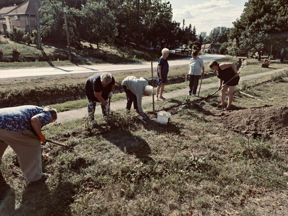 Felkapálták a gazos részeket és előkészítették a területet egy új kerti szegélyhez, amely több földet biztosít a rózsatöveknek a téli időszakra. Ősszel új tövekkel is pótoljuk a hiányokat, hogy teljes legyen a virágsor. A környék fokozatosan szépül, a szökőkút pedig jelenleg javítás alatt áll. A szétszerelés után szemcseszórással megtisztították, és nemsokára új festékréteget is kap – ismertették a bejegyzésben. Hozzátették: „Apránként, lépésről lépésre szépül ez a falurész is, köszönet érte a nyugdíjas klub tagjainak.”