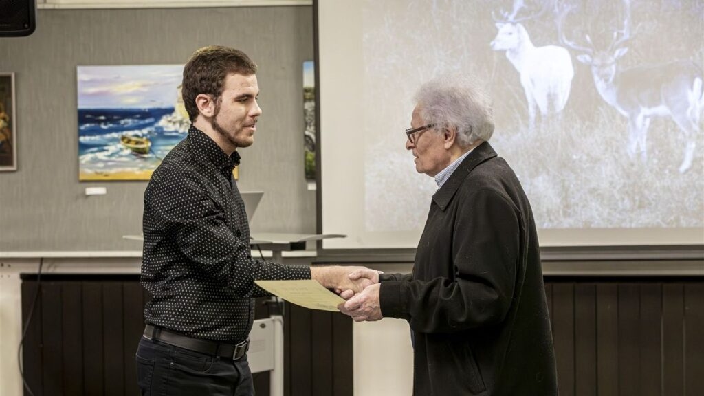 Kele Szabó Ágnes vetítés keretében mutatta be azokat a Salgótarján és környéke éjjel-nappal című kiállítást is meghatározó főbb témákat, amelyek a 2002-ben született fiatalember érdeklődésének, egyedi látásmódjának középpontjában állnak. Pozsik Gábor előszeretettel fotózza a természet szépségeit s több képén, különböző élethelyzetben is feltűnnek szeretett madarai, a gólyák.