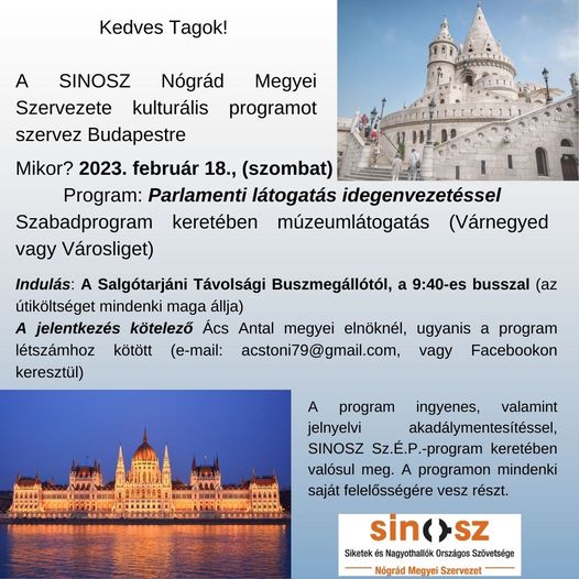 A Siketek és Nagyothallók Országos Szövetségének Nógrád Megyei Szervezete egy kulturális programot szervezett tagjainak szombatra, amely keretében felfedezhetik Budapesten a parlamentet egy idegenvezető segítségével, majd szabadprogramként múzeumlátogatásra lesz lehetőségük – írják a szervezet közösségi oldalán. Hozzátették, a program ingyenes, valamint jelnyelvi akadálymentesítéssel valósulhat meg.
