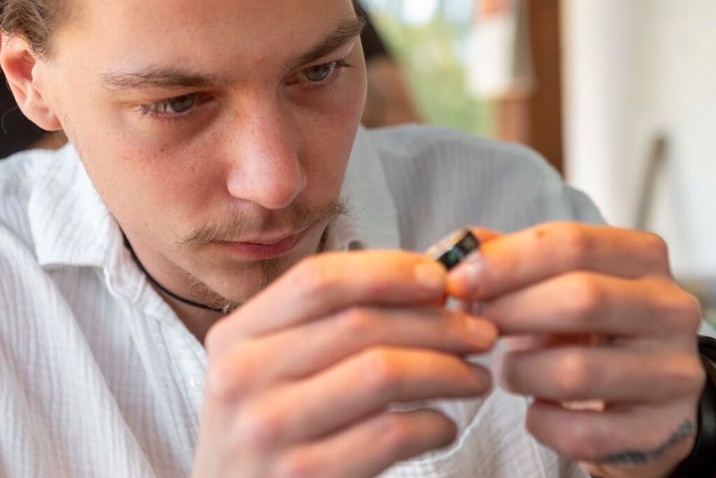 – Az így kialakított huzalból készülhet például gyűrű – mondja Dominik, aki aranyműves, ebben a szakmában is szeretne elhelyezkedni. Ékszerdobozából igazán különleges fülbevalók, karkötők kerülnek elő, van amit kagylóhéj díszít. Nem mindennapi az a gyűrűpár sem, amin éppen dolgozik és amit egy alkotói pályázatra készít.