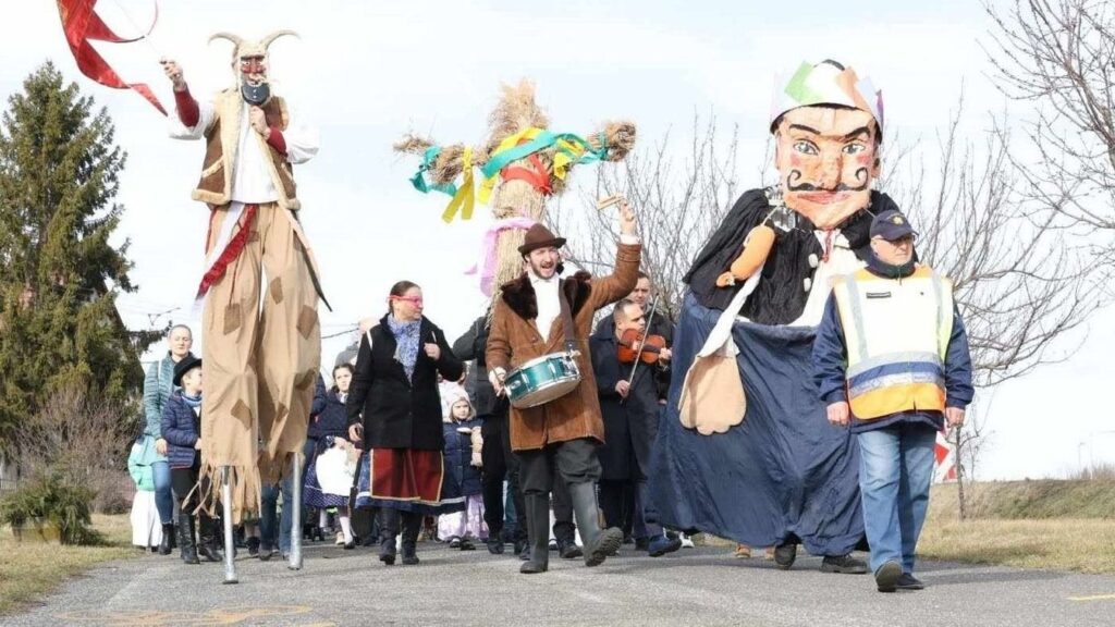 Amikorra odaértek a nagyparkolóba, záródott a gyűrű, a résztvevők keretet alkottak, közéjük topogott be a gólyalábas mutatványos, és társával együtt megidézték mindazt a falusi hangulatot, ami a farsangi időszak nélkülözhetetlen kelléke. Incselkedtek a fiatalasszonyokkal, kedveskedtek az apró lányoknak, és sok-sok olyan dalt énekeltek, amit az óvodások, illetve iskolások az intézményi foglalkozások során is rendszeresen hallhatnak-gyakorolhatnak, mint például az „Itt a farsang, itt a bál, keringőzik a kanál…” kezdetű nóta.