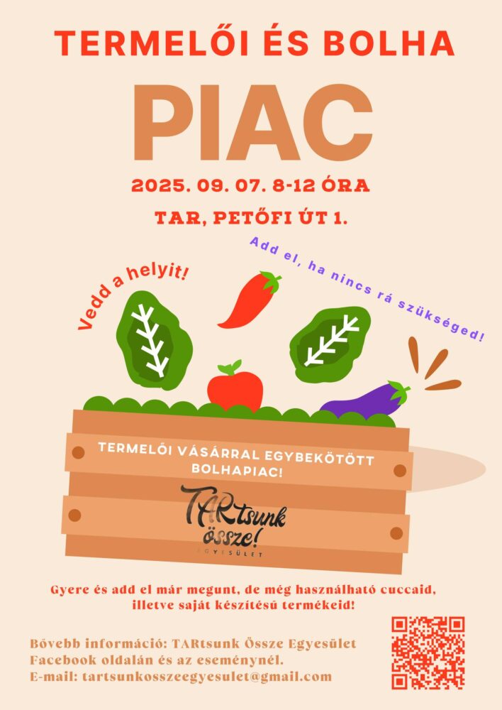 Immár második alkalommal rendeznek termelői vásárt és bolhapiacot szeptember 7-én, vasárnap Taron, a régi iskola udvarán, a Petőfi út 1. szám alatt. A piacon számos portéka közül válogathatnak majd a látogatók, például lesznek használtruhák, játékok, gyűjtemények, antikvitások, illetve kézműves termékek is. Az eseményen ingyenes lesz az árusítás, de előzetes jelentkezéshez kötött, amelyhez a TARtsunk Össze Egyesület Facebook-oldalán találhatnak online formanyomtatványt az érdeklődők. Egyéb információért a tartsunkosszeegyesulet@gmail.com e-mail címen lehet érdeklődni.