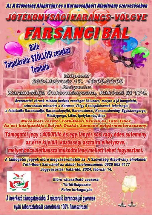 A Szövetség Alapítvány és a Karancsaljáért Alapítvány szervezésében február 17-én, szombaton, 18 órától jótékonysági Karancs-völgye bált tartanak a karancsaljai polgármesteri hivatalban.