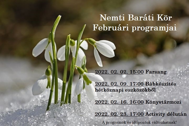 A Nemti Baráti Kör tagjai hetente összegyűlnek és együtt töltenek egy kellemes délutánt. Legutóbb farsangi mulatságot tartottak, február 16-án, szerdán, 16 órától pedig könyvtármozit szerveznek, amelyen a tervek szerint egy színdarabot néznek meg.