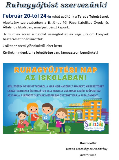 A Teret a Tehetségnek Alapítvány szervezésében idén is ruhaneműt gyűjtenek a bátonyterenyei II. János Pál Pápa Katolikus Általános Iskolában – olvasható az intézmény Facebook-oldalán. Az alapítvány kuratóriuma arra kéri a diákokat és a szülőket, hogy az otthon található, feleslegessé vált ruhaneműt, kiegészítőket és a különféle lakástextilt február 20. és 24. között juttassák el az iskolába. Az összegyűjtött textíliáért pénzt kap az alapítvány, ezt tavaly az év végi jutalom könyvek beszerzésére fordították. Zsákokat az osztályfőnököktől igényelhetnek a tanulók.