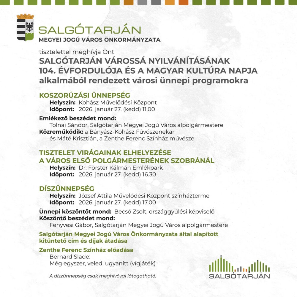 Ünnepeljük együtt a várossá nyilvánítás 104. évfordulóját és a Magyar Kultúra Napját 2026. január 27-én!