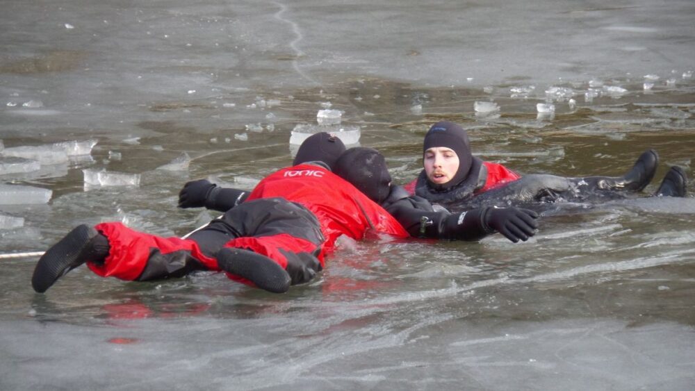 A szolgálat tagjai a gyakorlat során olyan speciális ruhákban tartózkodnak a vízben, amely megfelelő hőszigetelést biztosít, teljes egészében kívül tartja a vizet, belül pedig annyi levegőt tárol, hogy a felszínen tartja a mentőt. Általános szabály, hogy a bajbajutott megközelítésekor a lehető legnagyobb felületen osztjuk el a testsúlyunkat. A szolgálat saját ötlete volt, hogy a mentésre egy úgynevezett board-ot használunk, amelyen több helyen átfűzünk egy kötelet. Amikor a mentő megközelíti a bajbajutottat, átdob rajta egy kötélhurkot, majd a board-ot megpróbálja aláhelyezni. Amikor a parton álló személyzet elkezdi megfeszíteni a kötelet, akkor az azonnal hozzáfogja a bajbajutottat a board-hoz, aki egyúttal fel is fekszik a jég felszínére. A nyírjesi-tavon is ezzel a módszerrel mentettük a feltételezés szerint azt az embert, aki alatt beszakadt a jég – mondta Renner Péter. Hozzátette: – Emellett a jég alatti felkutatás technikáit is átismételtük. Szervezetünk három tagjának van olyan technikai búvár végzettsége, amellyel jég alá is merülhetnek. Az ehhez használt búvárfelszerelés sajátossága, hogy két független egységből áll, így bármelyik meghibásodása esetén van egy teljes értékű tartalék odalent. Erre azért van szükség, mert a jég alatt a búvár csak saját magára és a felszerelésére számíthat. Mentőbázisunkon a vízi baleseti egységünk mellett a nap 24 órájában két ilyen felszerelés is készenlétben áll. Ez egy nagyon komoly szaktudást igénylő feladat, amelynek a szinten tartása rendkívül fontos a számunkra.