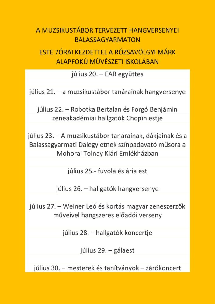 Július 25-én fuvola és ária esttel, július 26-án a hallgatók hangversenyével, július 27-én Weiner Leó és a kortárs magyar zeneszerzők műveiből álló hangszeres előadói versennyel, július 28-án pedig a hallgatók koncertjével kedveskednek az érdeklődőknek a művészeti iskolában. Július 29-én gálaestet tartanak, végül július 30-án a mesterek és a tanítványok közös koncertjével zárják a tábort.