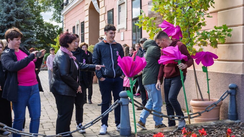 Végül a résztvevők elhelyezték a figyelemfelkeltő pink virágokat a Civitas Fortissima tér virágágyásaiban.