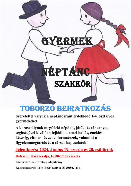 Gyermek néptánc szakköre iratkozhatnak be június 19-én, szerdán és június 20-án, csütörtökön, 16-tól 17 óráig az alsó tagozatos gyermekek a Mocsáry Antal Általános Iskola Karancsaljai Tagintézményében. A foglalkozás a korosztálynak megfelelően elősegíti a fiatalok fejlődését, javítja a zenei hallást, az éneklési készséget, a ritmus- és zenei formaérzéket, valamint a figyelemmegtartást és a társas kapcsolatokat is.