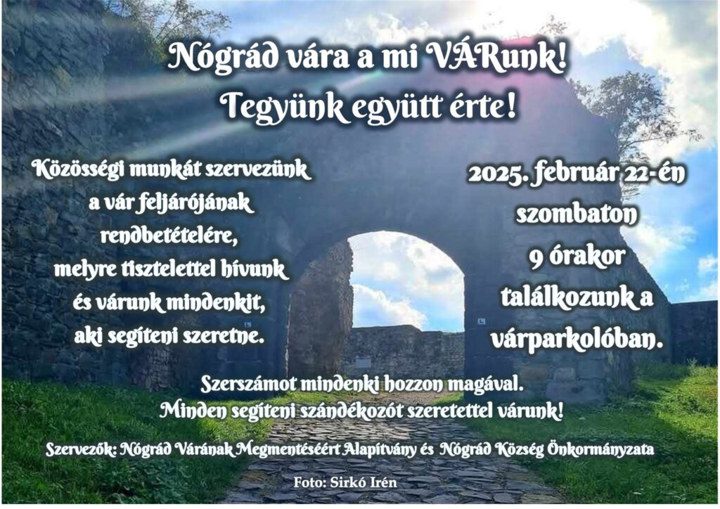 A Nógrád Várának Megmentéséért Alapítvány és Nógrád Község Önkormányzata ismét közösségi munkát szervez. Február 22-én, szombaton 9 órakor találkoznak majd a megmozduláshoz csatlakozni kívánó önkéntesek a várparkolóban azért, hogy összefogásuk nyomán még szebbé, rendezettebbé tegyék Nógrád várának feljáróját.