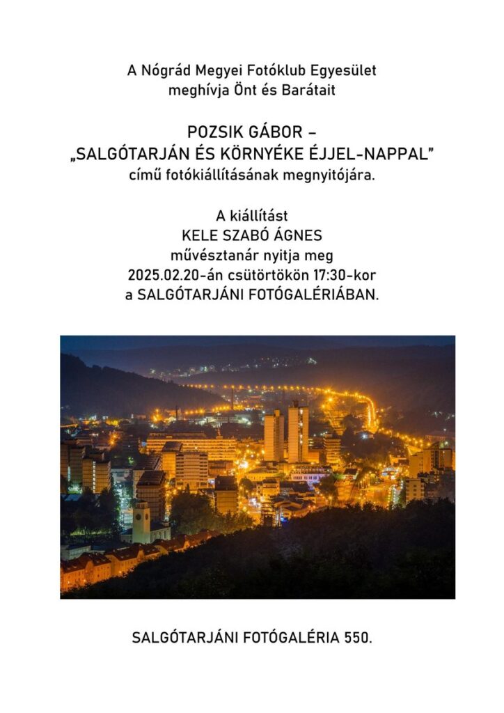 Salgótarján és környéke éjjel-nappal címmel nyílik meg Pozsik Gábor fotókiállítása a József Attila Művelődési Központban, február 20-án, csütörtökön 17.30 órakor a Nógrád Megyei Fotóklub Egyesület szervezésében. A tárlatot Kele-Szabó Ágnes művésztanár ajánlja a jelenlévők figyelmébe.