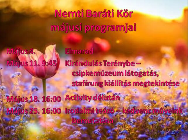 Soron következő foglalkozását május 11-én, szerdán tartja a Nemti Baráti Kör. A csoport tagjai kirándulást szerveznek erre az alkalomra. A megye nyugati felébe, Terénybe látogatnak el, itt a Hunnia Csipkemúzeumban kiállított kézimunkákat csodálják meg, megnézik a stafírungkiállítást és a falu más nevezetességeit is.