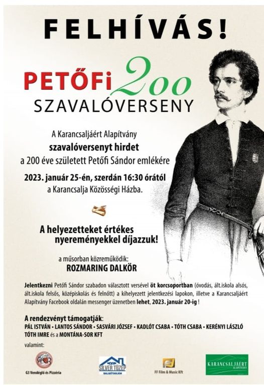 Petőfi 200 címmel rendez szavalóversenyt a Karancsaljáért Alapítvány. A megmérettetést január 25-én, szerdán 16.30 órától tartják a Karancsalja Közösségi Házban. Horváth-Szántó Csilla, az alapítvány elnöke arról számolt be, hogy korábban Ady Endre születésének századik évfordulójára hasonló programmal készültek.