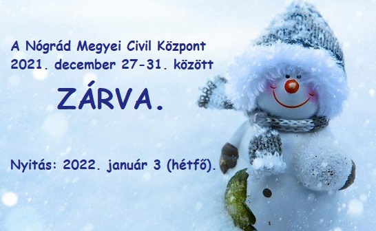 A Nógrád Megye Civil Központ karácsony és szilveszter között zárva tart. Az új évben változatlan nyitvatartással (minden hétköznap 9.00 és 16.00 óra között) várjuk a civil szervezetek képviselőit.