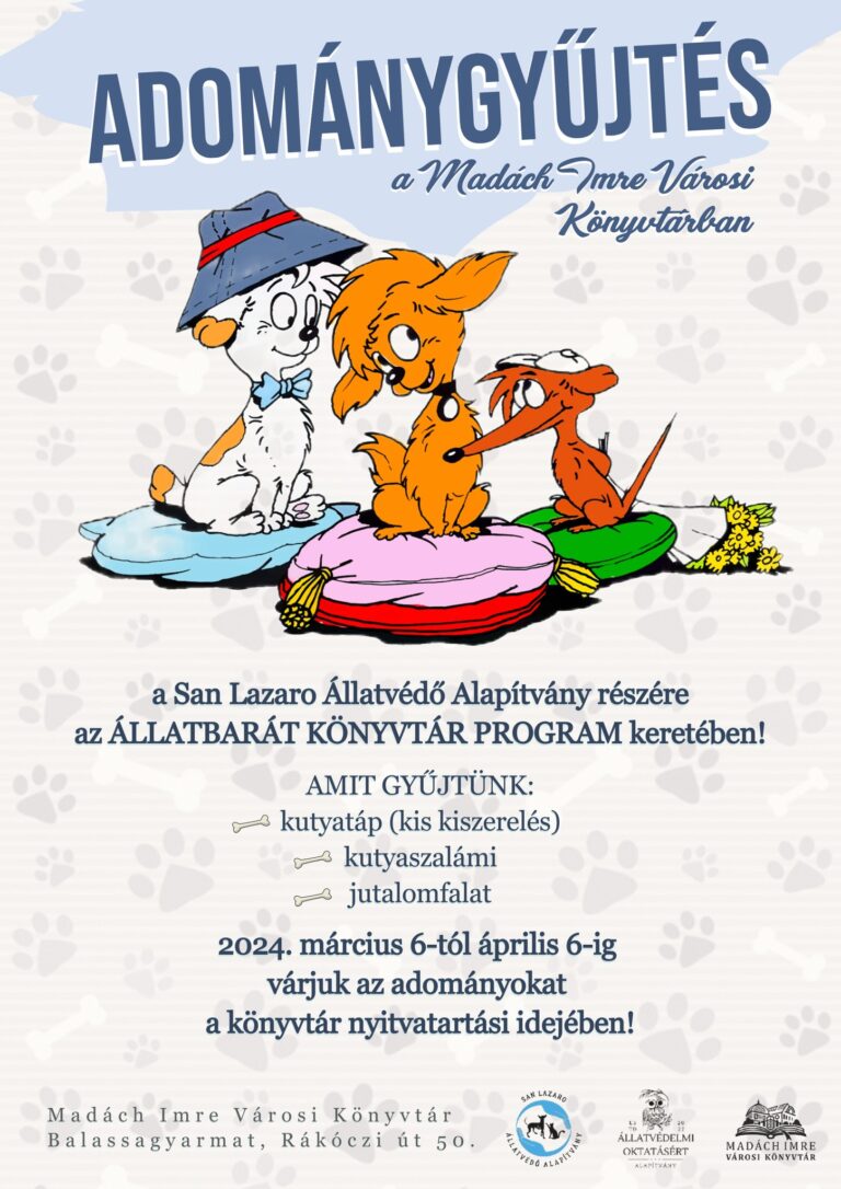A Madách Imre Városi Könyvtár várja az adományokat az újonnan nyílt balassagyarmati kutyamenhely számára. Mint arról beszámoltunk: Balassagyarmat önkormányzata a barnamezős területek rehabilitációját célzó projekten belül alakította ki a Harap utca 3. szám alatt a kutyamenhelyként is üzemelő gyepmesteri telepet, amelyet a San Lazaro Állatvédő Alapítvány január óta működtet.
