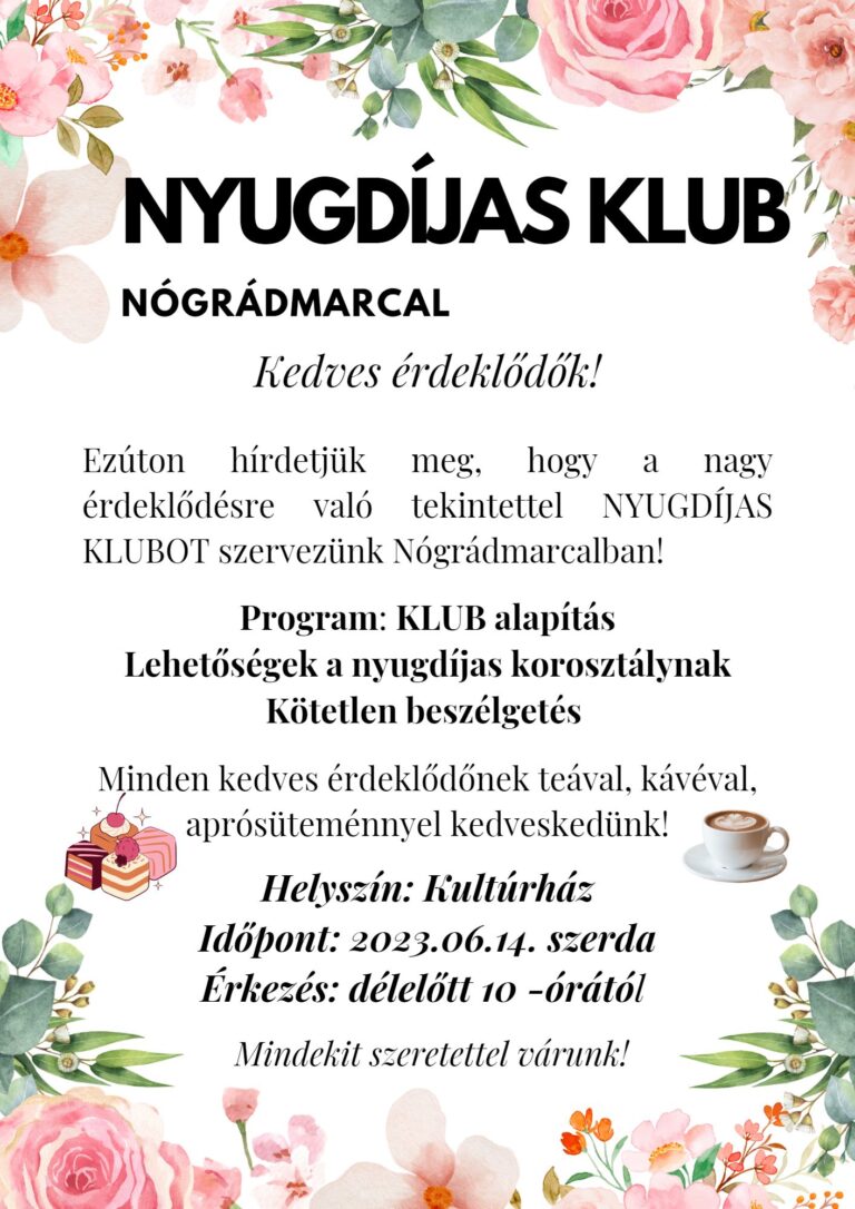 A település önkormányzata a közösségi oldalán adta hírül, hogy a nagy érdeklődésre való tekintettel nyugdíjas klubot szerveznek a községben. Ezzel kapcsolatban június 14-én, szerdán, 10 órától várják az érdeklődőket a helyi kultúrházban.