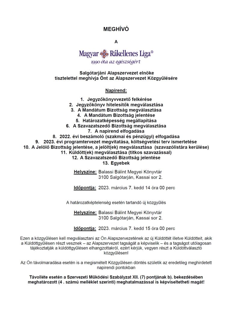 Közgyűlést tart a Magyar Rákellenes Liga Salgótarjáni Alapszervezete március 7-én, kedden 14 órától a Balassi Bálint Megyei Könyvtárban. Az alapszervezet közösségi oldalán megosztott tájékoztatás szerint az esemény napirendi pontjai között szerepel a 2022. évi – szakmai és pénzügyi – beszámoló elfogadása, a 2023. évi programtervezet megvitatása, valamint a költségvetési terv ismertetése.