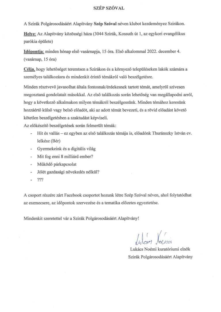 Szép szóval néven indít klubot a Szirák Polgárosodásáért Alapítvány a településen – közölte a szervezet közösségi oldalán. Mint arról beszámoltak: a kezdeményezés célja, hogy lehetőséget teremtsen a faluban és a környező településeken lakók számára a személyes találkozásra és a mindenkit érintő témákról való beszélgetésre.