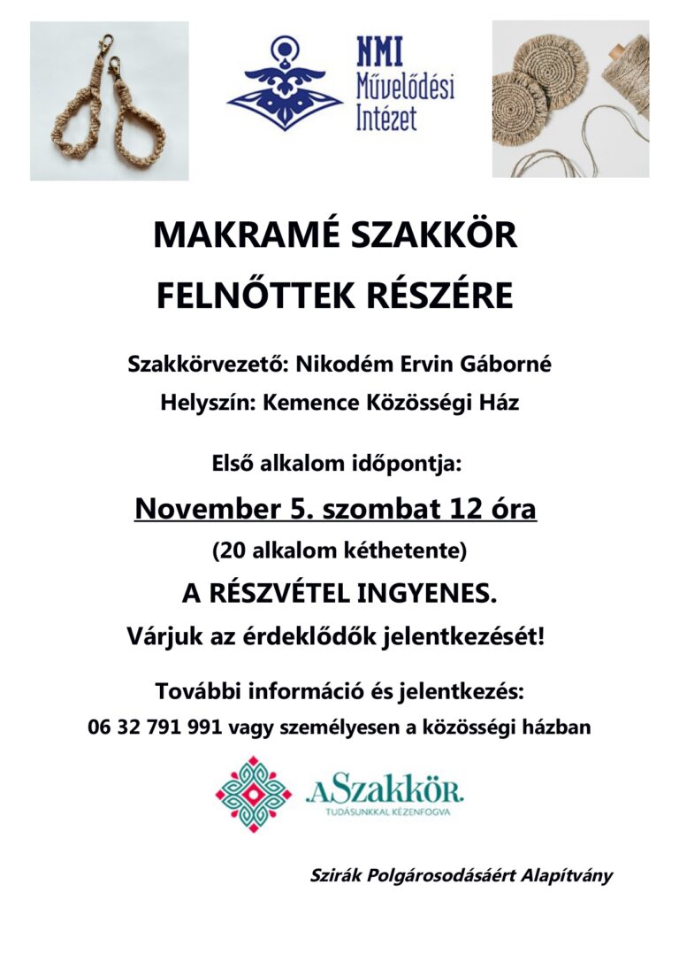 Makramé szakkör indul felnőtteknek a településen november 5-én, szombaton 12 órától – közölte a Szirák Polgárosodásáért Alapítvány közösségi oldalán. Összesen 20 foglalkozást tartanak majd a Kemence Közösségi Házban. A szakkört a Nemzeti Művelődési Intézet támogatásával valósítják meg.
