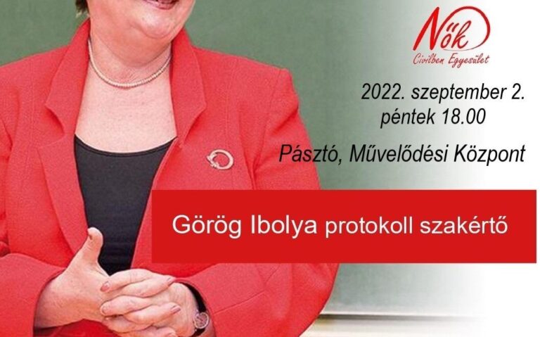 Mindennapi és online protokoll címmel tart előadást Görög Ibolya protokollszakértő szeptember 2-án, pénteken 18 órától a helyi művelődési központban. A rendezvény, amely a Nők Civilben Egyesület szervezésében valósul meg, ingyenesen látogatható.