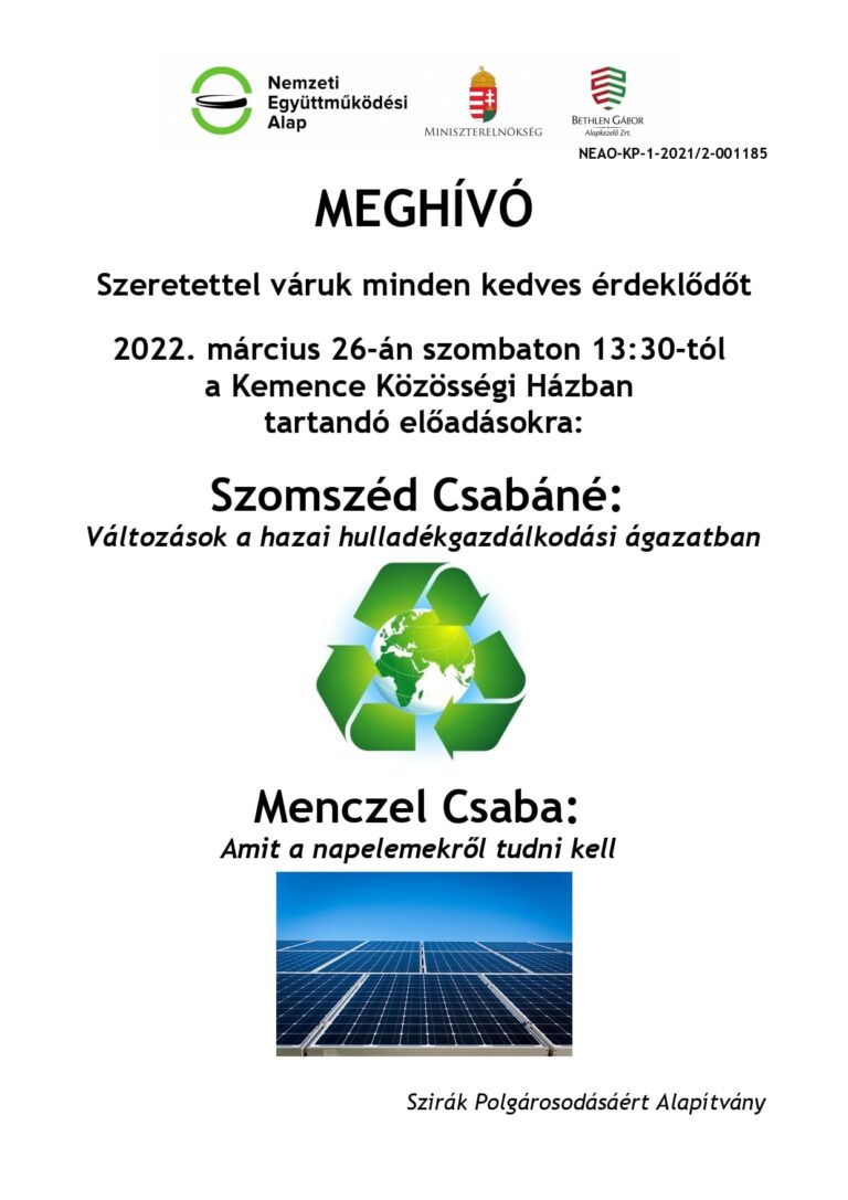 Különleges előadásokkal várják a helyieket március 26-án, szombaton, 13.30-tól a Kemence Közösségi Házban – közölte a Szirák Polgárosodásáért Alapítvány közösségi oldalán. Az érdeklődők a hazai hulladékgazdálkodási ágazatban történő változásokról és a napelemekről is bővebb tájékoztatást kaphatnak.