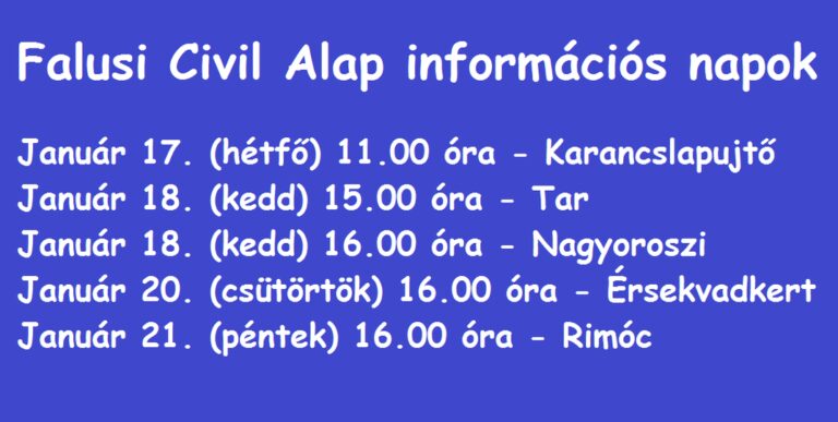 A Nógrád Megyei Civil Közösségi Szolgáltató Központ és kistérségi partnerei januárban 5 helyszínen, 5 alkalommal rendez információs rendezvényeket a Falusi Civil Alap pályázati kiírásáról.A program során nemcsak a pályázat, hanem a NIR rendszer is bemutatásra kerül, gyakorlati ismeretekhez is juttatva a résztvevőket.