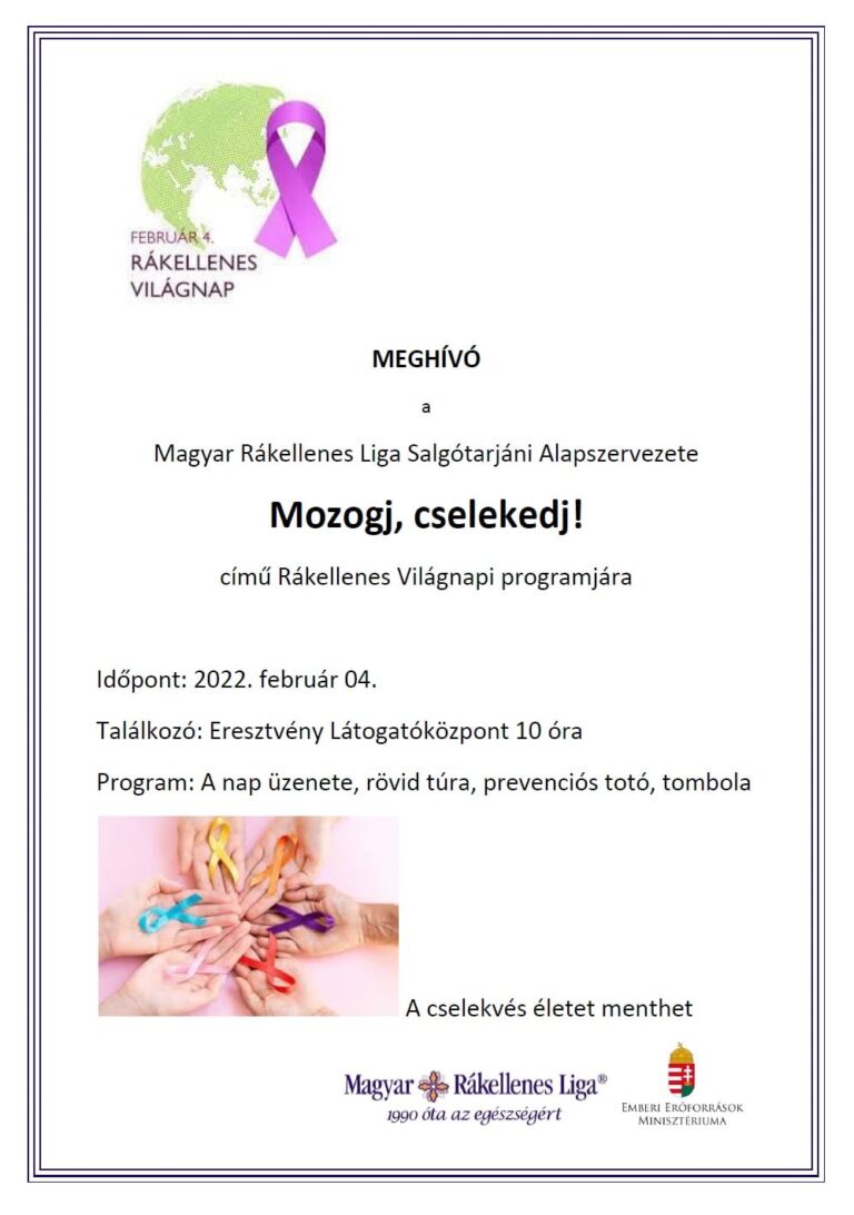 A rákellenes világnapon, február 4-én Mozogj és cselekedj címmel hirdet programot a Magyar Rákellenes Liga Salgótarjáni Alapszervezete. Az Eresztvényi Látogatóközpontban 10 órakor elhangzik a nap üzenete, majd rövid túra után prevenciós totóval és tombolával is készülnek az érdeklődők számára.