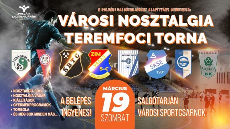 Városi Nosztalgia Teremfoci Tornát rendez március 19-én a salgótarjáni sportcsarnokban a Polgári Salgótarjánért Alapítvány. A nyolc jelenleg is működő vagy egykori labdarúgó egyesület meccsei mellett számos kísérőprogrammal is megidézik majd a városi futballélet kiemelkedő időszakát.